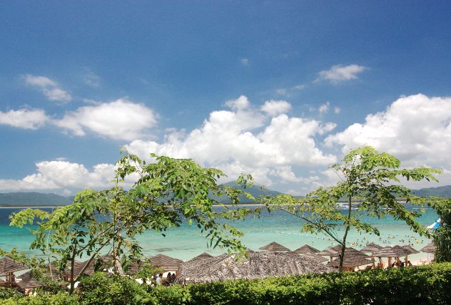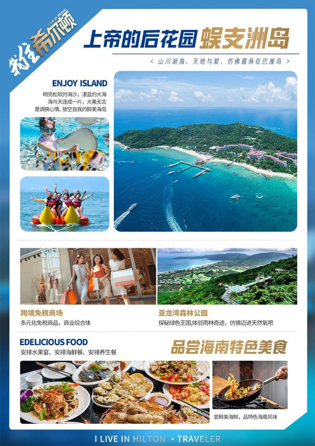 蜈支洲岛(游览约120分钟)三面漫山叠翠,2700多种原生植物郁郁葱葱,四周海域清澈透明,海水能见度6-27米,是闻名的潜水基地。岛上景点极具浪漫风情,有情人 桥、观浪亭、观海长廊、“HAPPY LOVE ”标志等。这里是冯小刚电影《私人订制》的拍摄地,面向大海一排浪漫的白色观景座椅现在已是蜈支洲最热门的景点之一。