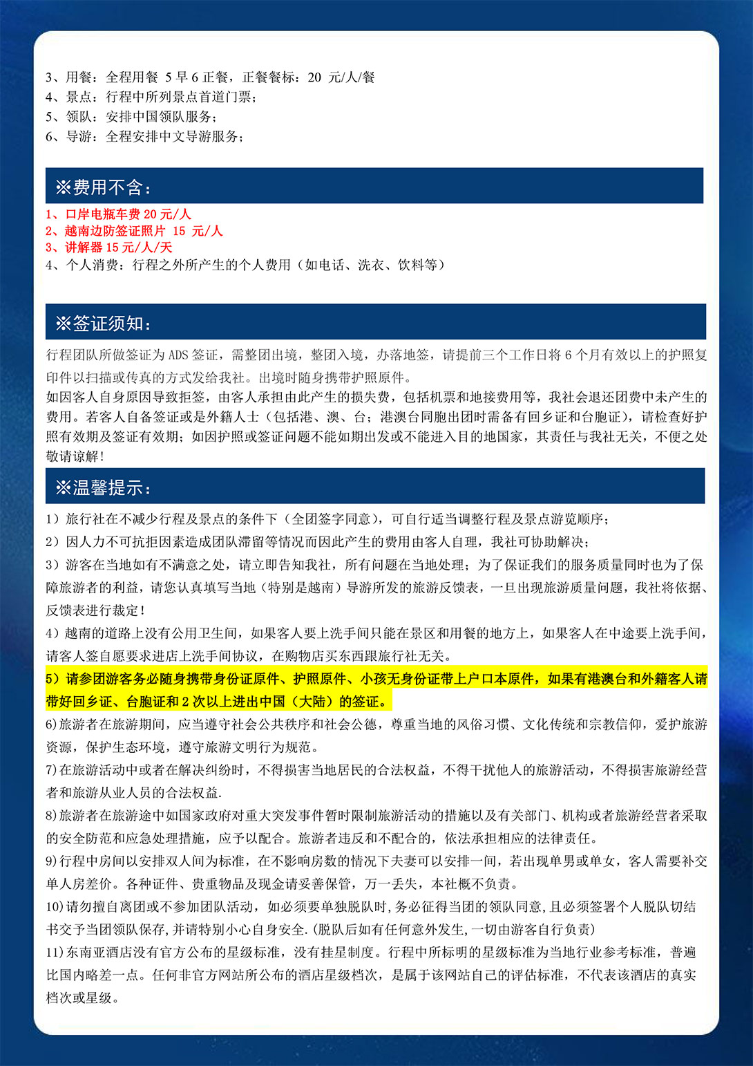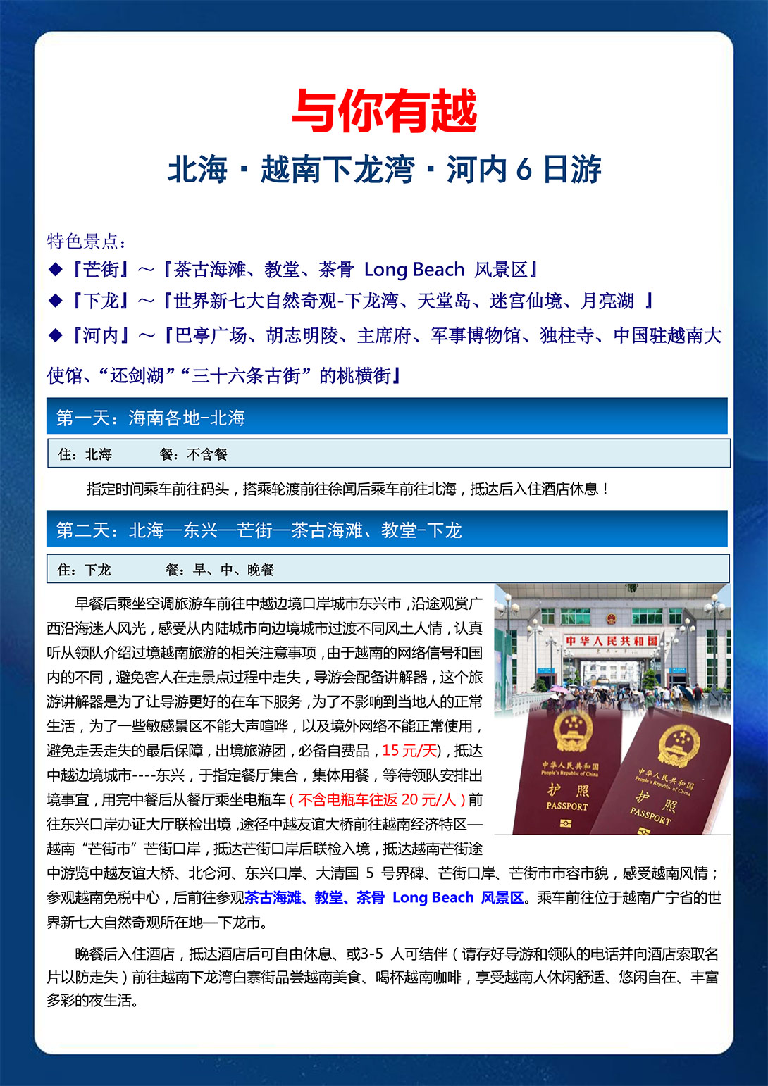 早餐后乘坐空调旅游车前往中越边境口岸城市东兴市,沿途观赏广西沿海迷人风光,感受从内陆城市向边境城市过渡不同风土人情,认真听从领队介绍过境越南旅游的相关注意事项,由于越南的网络信号和国内的不同,避免客人在走景点过程中走失,导游会配备讲解器,这个旅游讲解器是为了让导游更好的在车下服务,为了不影响到当地人的正常生活,为了一些敏感景区不能大声喧哗,以及境外网络不能正常使用,避免走丢走失的最后保障,出境旅游团,必备自费品,15 元/天),抵达中越边境城市----东兴,于指定餐厅集合,集体用餐,等待领队安排出境事宜,用完中餐后从餐厅乘坐电瓶车(不含电瓶车往返 20 元/人)前往东兴口岸办证大厅联检出境,途径中越友谊大桥前往越南经济特区—越南“芒街市”芒街口岸,抵达芒街口岸后联检入境,抵达越南芒街途中游览中越友谊大桥、北仑河、东兴口岸、大清国 5 号界碑、芒街口岸、芒街市市容市貌,感受越南风情;参观越南免税中心,后前往参观茶古海滩、教堂、茶骨 Long Beach 风景区。乘车前往位于越南广宁省的世界新七大自然奇观所在地—下龙市。 晚餐后入住酒店,抵达酒店后可自由休息、或3-5 人可结伴(请存好导游和领队的电话并向酒店索取名片以防走失)前往越南下龙湾白寨街品尝越南美食、喝杯越南咖啡,享受越南人休闲舒适、悠闲自在、丰富多彩的夜生活。 特别说明:行程中途经的休息站、加油站、公共卫生间等地停留仅供休息和方便之用,游客购物为个人自主行为,游客因购物产生的纠纷与旅行社无关。2. 对景区内设立的商店、路店,请游客三思、如需购买或食用敬请谨慎,不做进店范畴。如自行购买商品如出现质量问题,旅行社不承担任何责任,敬请知晓。3. 公园、博物馆、展览馆、体验馆、制作工场附设商品销售为景区设施,仅供了解当地特色文化之用,游客购物为个人自主行为,游客因购物产生的纠纷与旅行社无关,敬请知晓。 餐:早、中、晚餐 住:下龙