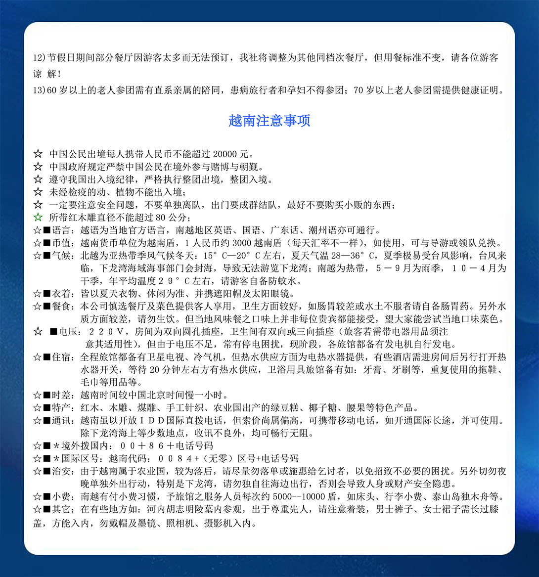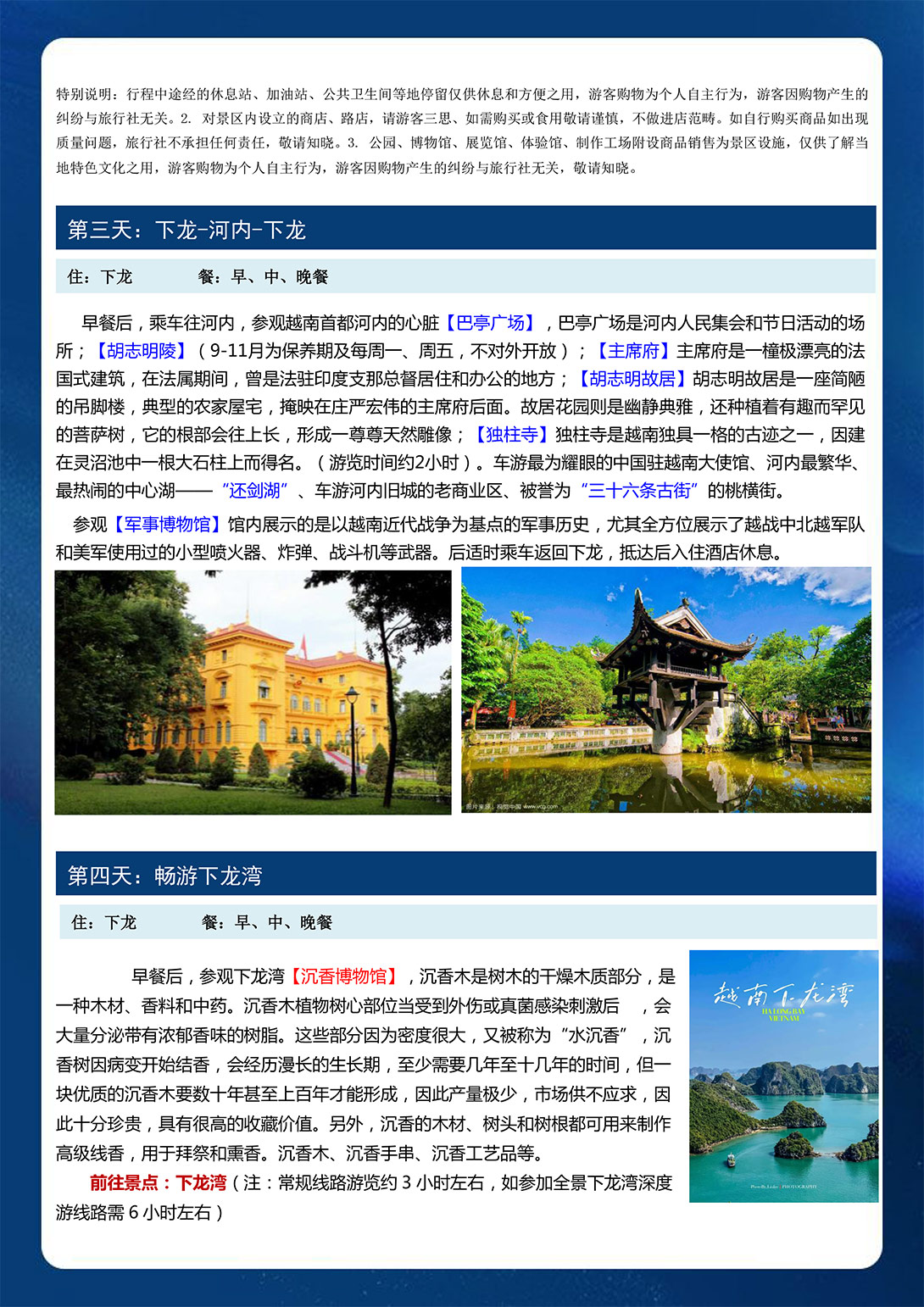 早餐后,参观下龙湾【沉香博物馆】,沉香木是树木的干燥木质部分,是一种木材、香料和中药。沉香木植物树心部位当受到外伤或真菌感染刺激后 ,会大量分泌带有浓郁香味的树脂。这些部分因为密度很大,又被称为“水沉香”,沉香树因病变开始结香,会经历漫长的生长期,至少需要几年至十几年的时间,但一块优质的沉香木要数十年甚至上百年才能形成,因此产量极少,市场供不应求,因此十分珍贵,具有很高的收藏价值。另外,沉香的木材、树头和树根都可用来制作高级线香,用于拜祭和熏香。沉香木、沉香手串、沉香工艺品等。 前往景点:下龙湾(注:常规线路游览约 3 小时左右,如参加全景下龙湾深度游线路需 6 小时左右) 前往码头,乘船游览人生必去的50个地方之一 “海上仙境下龙湾”(被评为世界八大自然遗产之一【海上桂林】,(游览时间约3H)(在1500多平方公里的海面上、耸立着3000多座大小不一、千姿百态的喀斯特地貌的山石、更以其“海美、山幽、洞奇”三绝而享誉天下) 【下龙湾】景区分ABC三线: A线:越南名信片标志 推荐指数:★★★★★ 狗爬石、香炉石、斗鸡石等数不胜数的风景尽收眼底,下龙湾亦有小渔船如影相随,也可自行购买海鲜交由船家加工,享受专属于自己的海鲜大餐,把酒临风,在海天一色之间大快朵颐...... B线:天堂岛 推荐指数:★★★★★(费用自理) 越南最浪漫、最漂亮的岛屿—【天堂岛】细白的沙滩上可以玩各种沙滩游戏(游戏道具自备),在指定区域还可以游泳,登上岛屿的山顶俯视下龙湾海上桂林全景,拍摄您心意的美照天堂岛是下龙湾唯一有沙滩的岛屿,金黄色的沙滩,蔚蓝色的海水,仿佛置身世外桃源一般,登上天堂岛,领略“会当凌绝顶,一览众山小”的感觉环顾四周,如同进入蓬莱仙境。 C线:迷宫仙境+月亮湖+小游艇+小木船 推荐指数:★★★★★(费用自理) 游览下龙湾的精华景点之一【迷宫仙境】,随着游船观赏一座座的独立仙岩:大拇山、青蛙山、天鹅山等千姿百态的山石引入眼帘,乘坐小游艇前往月亮湖洞口,一路感受乘风破浪的酣畅淋漓,后换乘小木船进入洞内,月亮湖是一个 360 度皆为垂直绝壁的封闭海湾,空灵幽闭。悬崖峭壁之上,随处可见调皮可爱的海猴子(当地人也称之为:猴岛),在山间,湖边纵情嬉戏,湖水清澈见底,水平如镜,从上面俯瞰圆如满月,所以称为【月亮湖】,也是电影【金刚】以及【007—明日帝国】的拍摄取景地 情况说明 :由于下龙湾核心精华景点景区及摄影基地部分区域的水位较低,大船无法进入,若要进入精华景点片区需改乘小游艇及小木船进入)中午在船上,吹着海风吃着越南船家为大家准备的船餐,餐后缓缓向下龙湾码头驶去,返回码头下船,告别上帝赐于越南最好的礼物——下龙湾。适时入住酒店休息! 餐:早、中、晚餐 住:下龙