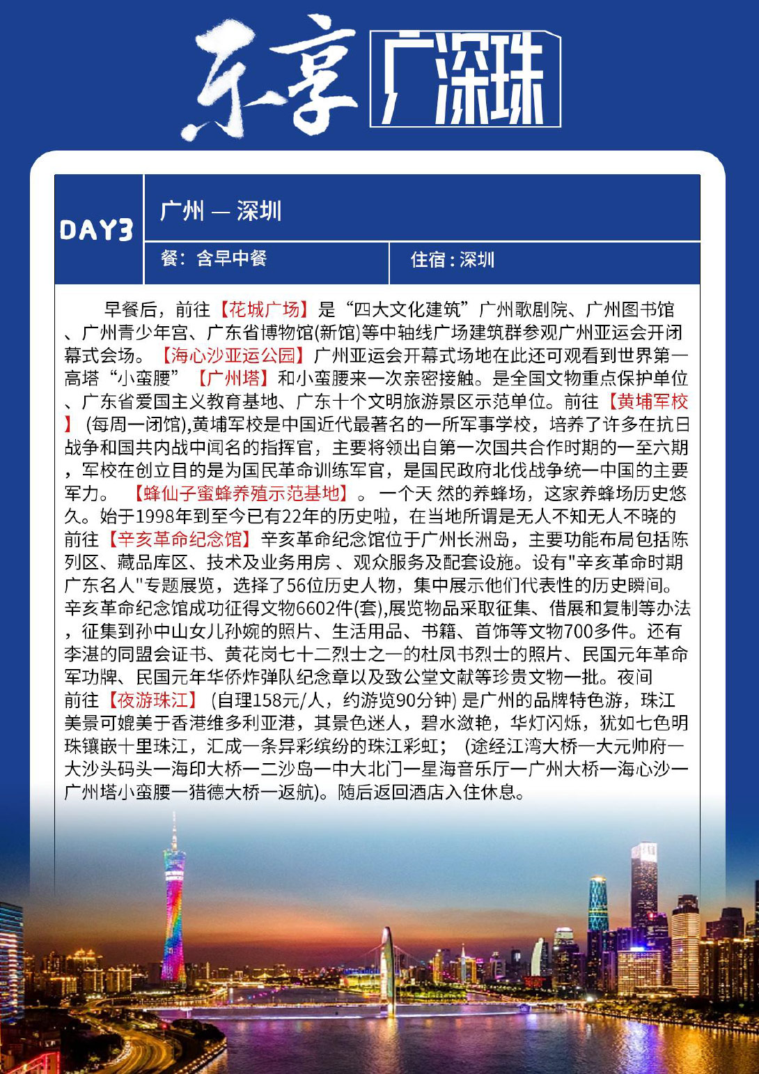 花城广场-海心沙亚运公园-黄埔军校-辛亥革命纪念馆 住:深圳