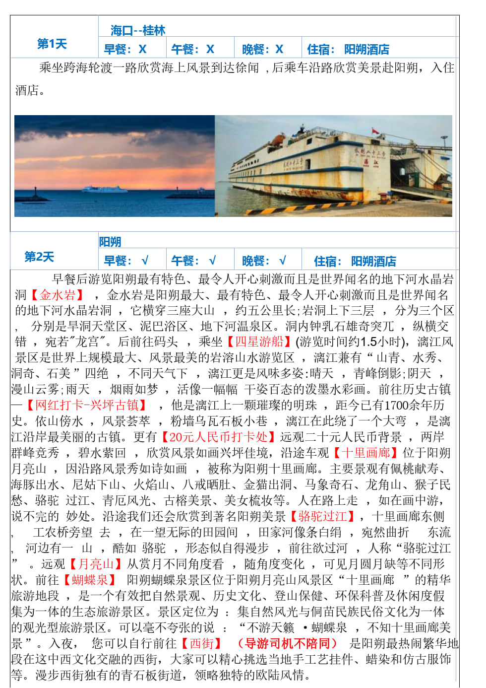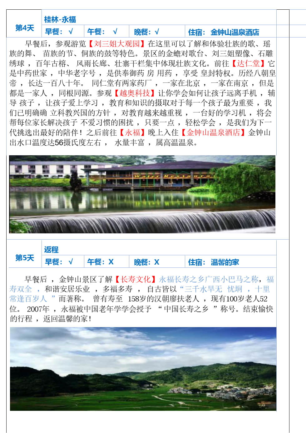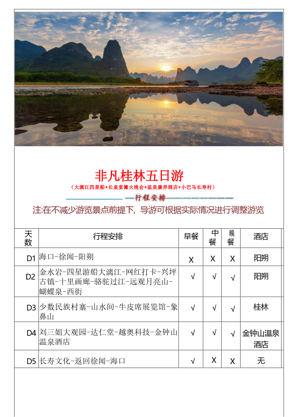 行程亮点: 1、全岛散拼+定点接送+电子合同+全程领队陪同 2、大漓江四星船游览漓江(游览时间约1.5小时) 3、升级一晚温泉养生酒店 4、升级一餐特色长桌宴+篝火晚会 5、深入世界五大长寿乡--永福金钟山