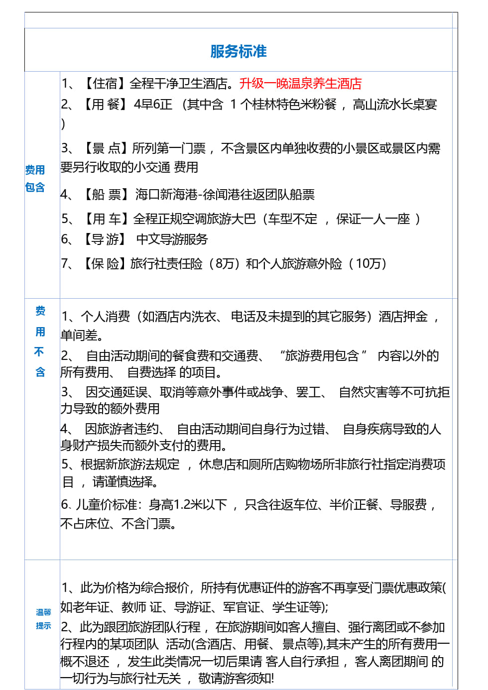 接待标准: 1、儿童价格:2-6岁 700元/人(只含餐车),7-12岁800元/人(只含餐车门票), 13-27岁以上1000元/人(餐车门票全含),不占床均不含早餐 2、升级一晚温泉养生酒店,单房差:240元/人 3、全程4早6正(其中含 1 个桂林特色米粉餐 ,高山流水长桌宴) 4、3店+1景购,景区内有购物商场,属于景区行为,不计入购物店
